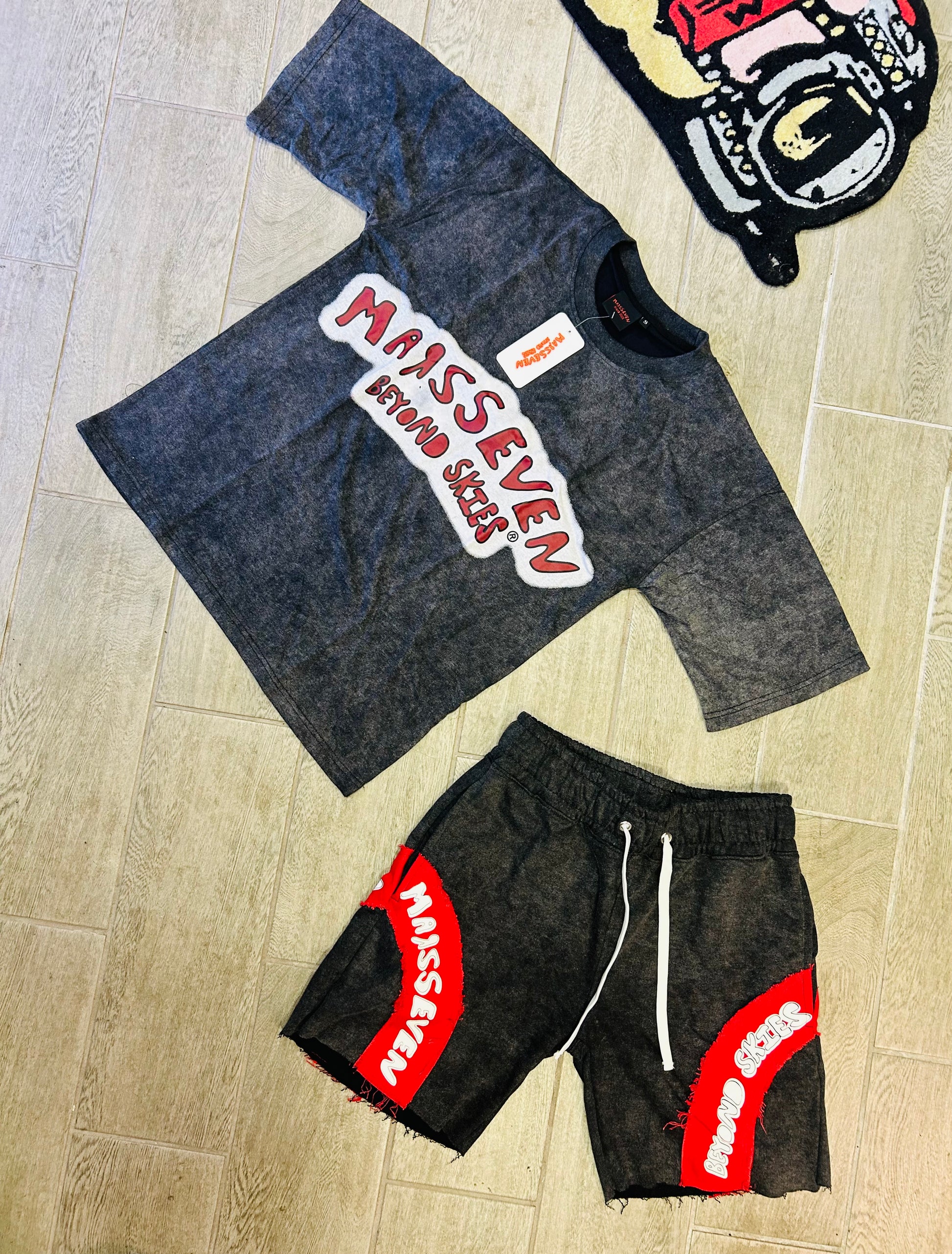 The shorts are cut from the same washed and distressed fabric for a perfectly coordinated look. Subtle fading and worn-in detailing give them a vintage edge, while the tailored yet relaxed fit keeps them versatile for everyday wear. Together, the set creates a bold, streetwear-ready silhouette that balances durability, comfort, and style.